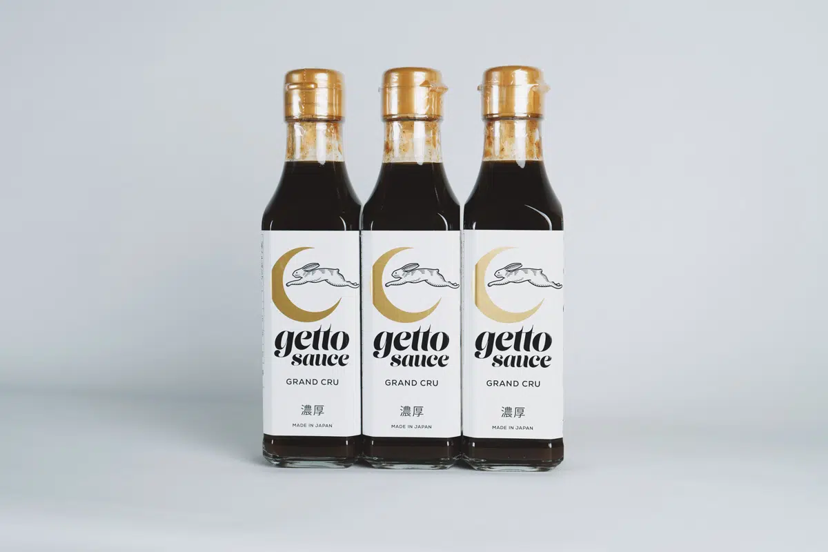 月兎ソース用のラベルの制作になります。高級感のあるラベルを作りたいとご相談いただきました。月のイラスト部分は金の箔押しをご希望でした。それとロゴマークをもっと際立たせるような提案が欲しいとのことです。素材はマットで冷蔵に耐えられる質感を希望で、ラベルは機械貼りとのことでした。