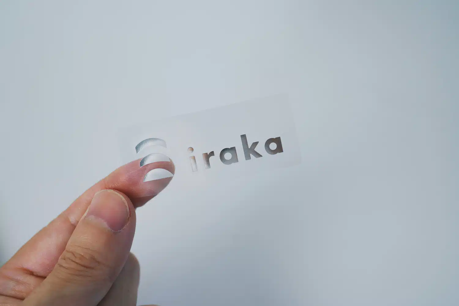 できるだけ目立たないよう、透明素材をベースに使用。高級感を演出するために箔押し加工をご提案し、いらか様のブランドイメージに合う「銀箔」を最終的に採用しました。箔の耐久性を高めるため、表面にはグロスラミネートを施しています。仕上げは配布用途に適した“ブチヌキ仕様”です。