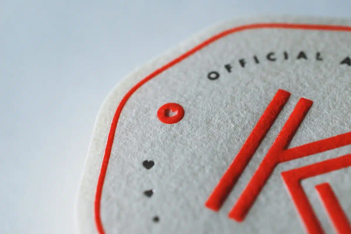 株式会社KOU様のコミュニティアプリ「KOU」のアンバサダー認定シールを制作しました。素材には、ナチュラルな風合いが特徴の和紙コットンを提案し、その独自の質感が高く評価されました。デザインは、金赤1色の印刷に加え、ご希望いただいたエンボス加工と銀の箔押しを施しました。