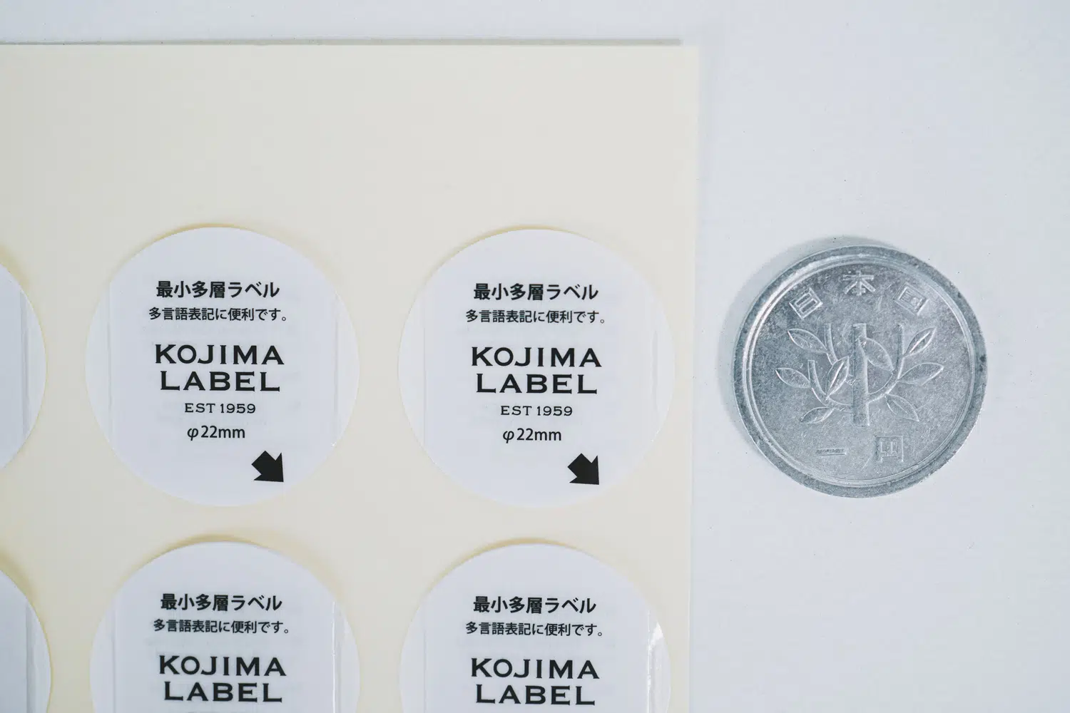 検証の結果、安定した印刷・加工精度を維持しつつ、貼りやすさや多層構造としての機能性を損なわない最小サイズはφ22mmであることが確認できました。これにより、従来よりもさらに小さなラベルで多層仕様を実現できることが実証された形になります。