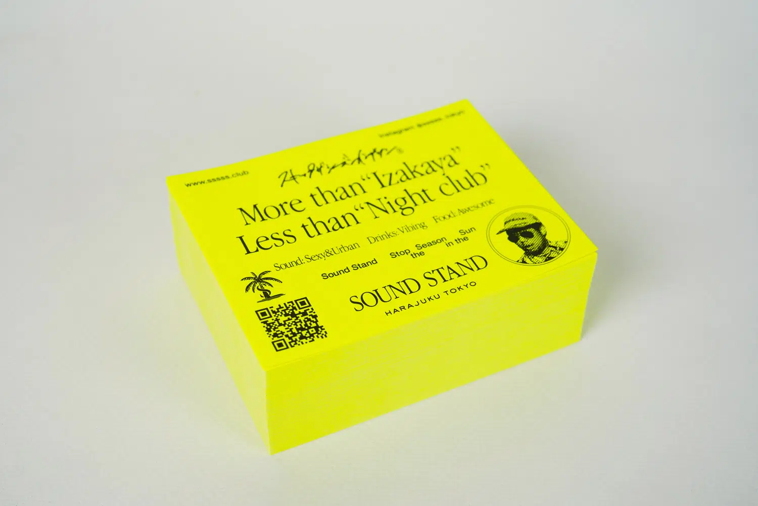 蛍光素材のシールの制作です。お問い合わせの時点で蛍光の黄色をご指定していただきました。ショップカードとして使いたいので仕上がりは断裁仕上げ、印刷は黒1色です。